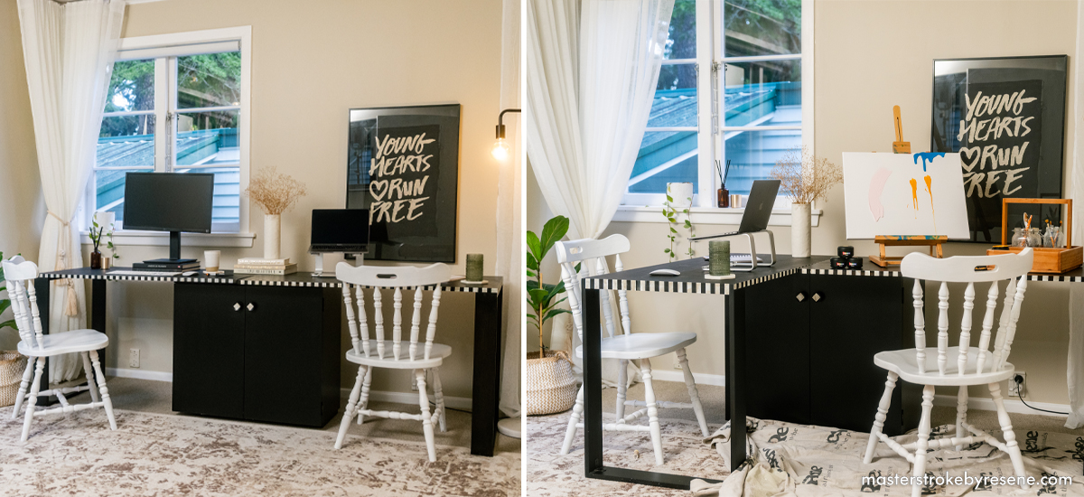 This versatile desk allows you to customise its layout to suit your needs for work, study or even hosting a meeting or seeing a client. The two-piece desktop is built from plywood and pine and sits over a thrifted cabinet, so is the perfect balance of upcycling and building. The cabinet is painted in Resene Lustacryl in smart Resene Black and the desktops and legs are finished in Resene Aquaclear satin mixed with Resene Colour Enhance Japan Black. The desk is elevated with a checked pattern painted in Karen Walker Chalk Colour in Resene Milk White and coated with Karen Walker Vintage Wax for an aged look.