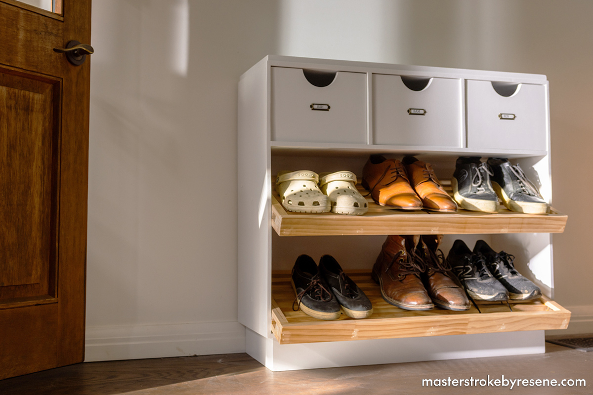 The clever design features individual drawers and slanted slatted racks, allowing family members to have their own space as well as easy access to the shoes on display.