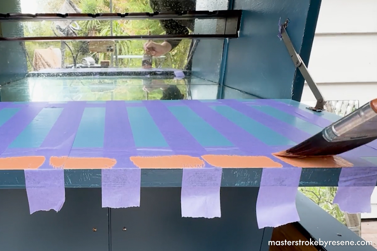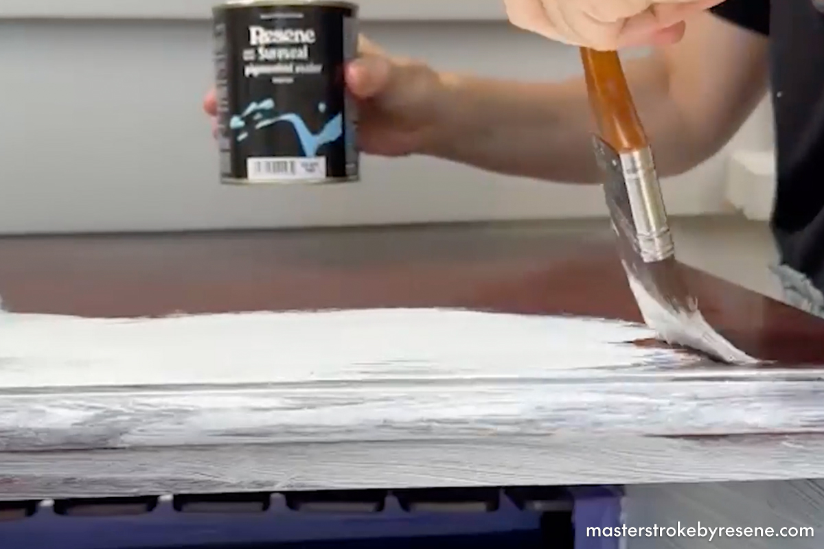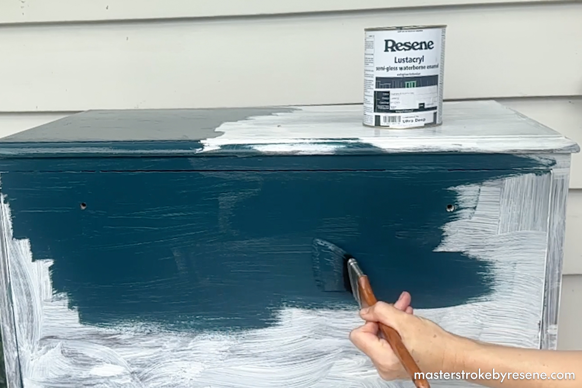 Gretchen opted to update the original mahogany timber finish with a striking new colour palette, incorporating Resene Lustacryl semi-gloss waterborne enamel in Resene Elephant, Resene Undercurrent and Resene Tuscany, which she uses to create a cool checkerboard design. Her secret weapon: Resene Waterborne Sureseal pigmented sealer. Using this as a base on previously varnished surfaces means you don’t need to sand anything back before you begin.