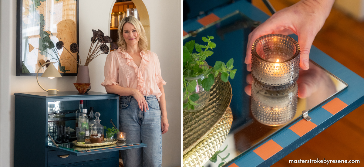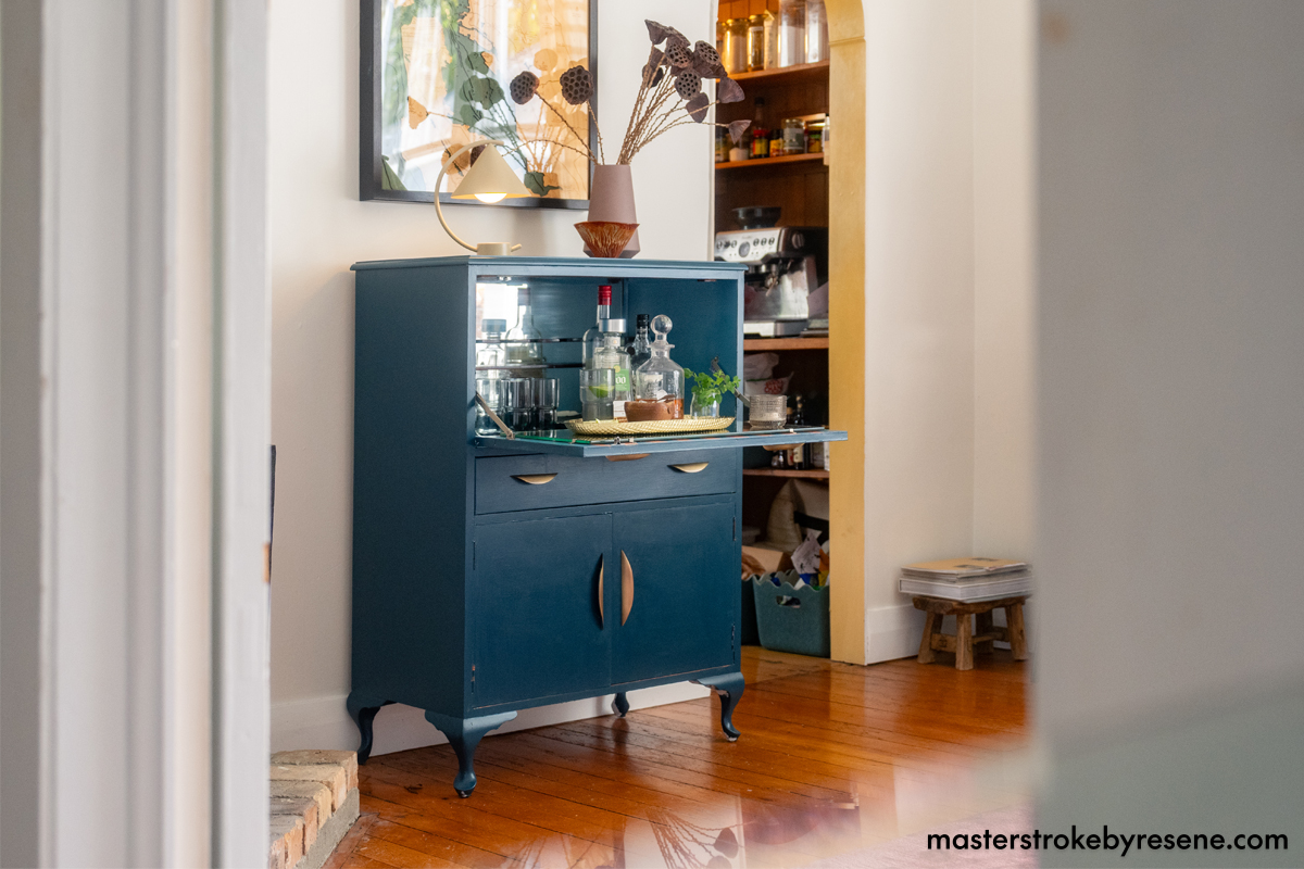 In this inspired thrift flip, clever upcycler Gretchen Lowe has given this second-hand bar cabinet a fun and stylish facelift using Resene paint. This Art Deco-style vintage piece is well crafted and opens up to offer storage for drinks, trays, mixers and glassware.