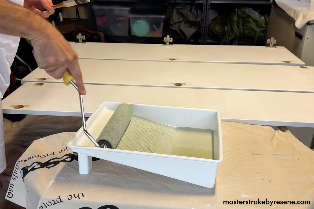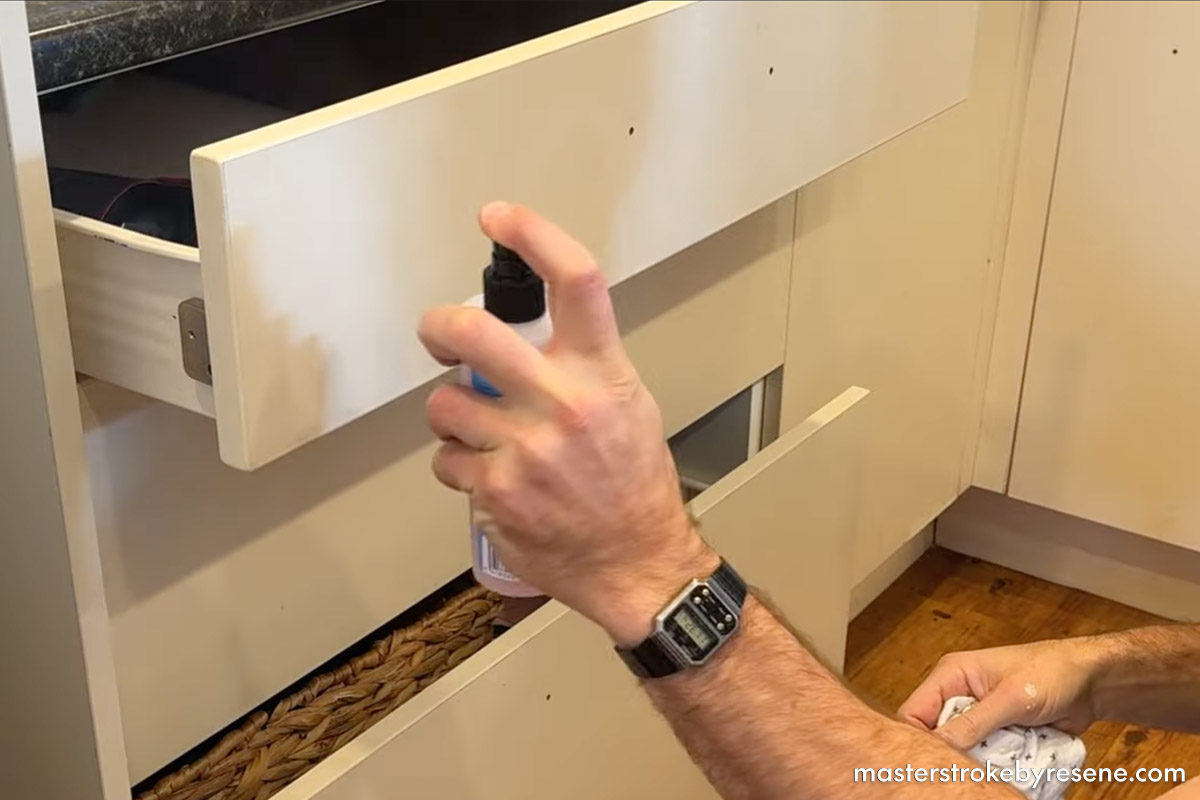Art first cleaned every surface with Resene Interior Paintwork Cleaner, which conveniently comes in a pre-mixed spray bottle from Resene ColorShops. It not only removes grime, but prepares the surface for priming and painting.