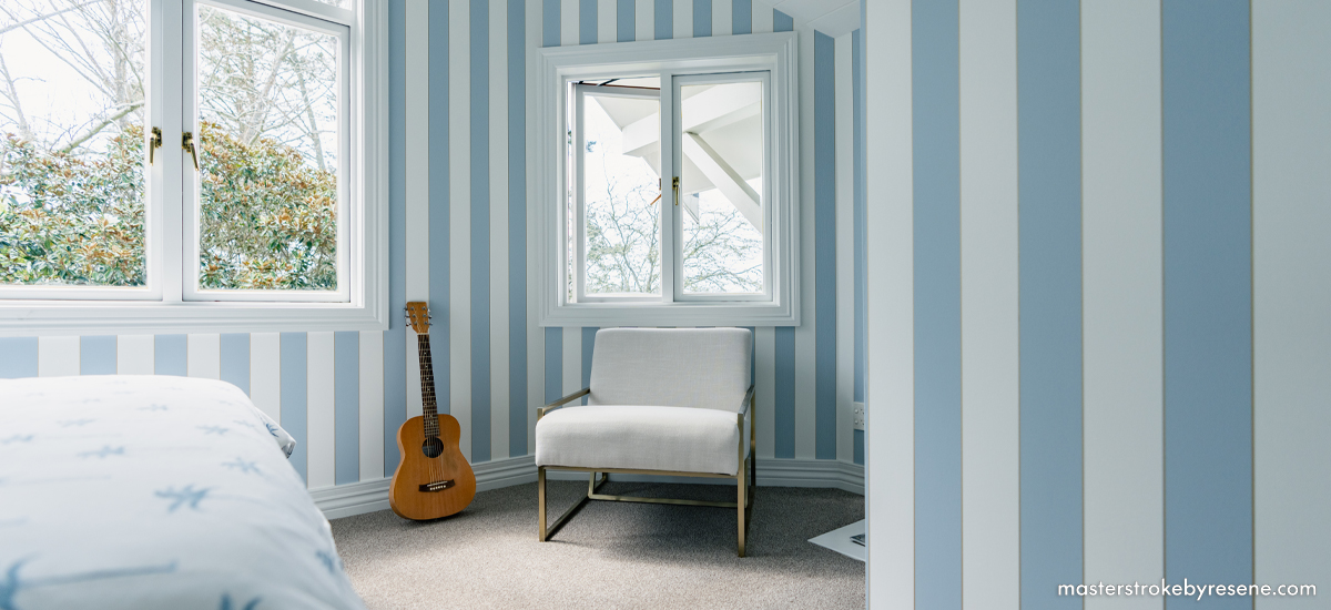 Christina knew that she wanted stripes, as it’s a timeless style that Zeph can grow into and that is “still cool when he’s a teenager,” she says. With Brenda’s help, they quickly narrowed down the best options in the Resene wallpaper library, which has thousands of colours and patterns to choose from.