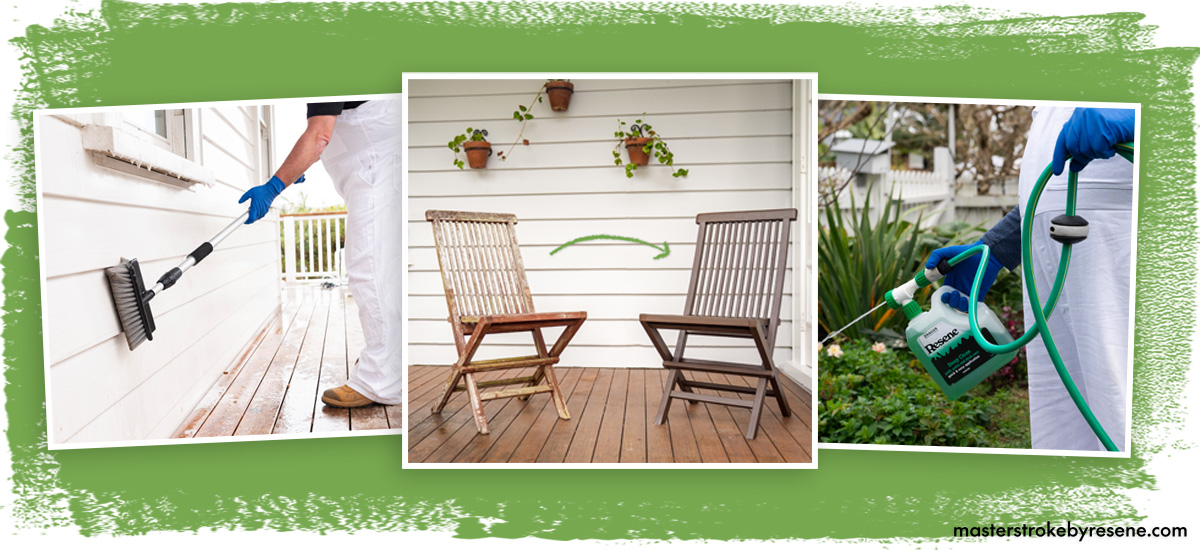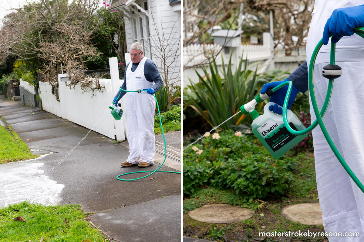 Use it twice a year on concrete and timber surfaces to keep them looking good. Dilute according to the product’s instructions, then spray it on. Over the next few days, mould and moss will turn an orange reddish colour and the Resene Deep Clean will continue to work over the coming months. The elements will take care of the rest.
